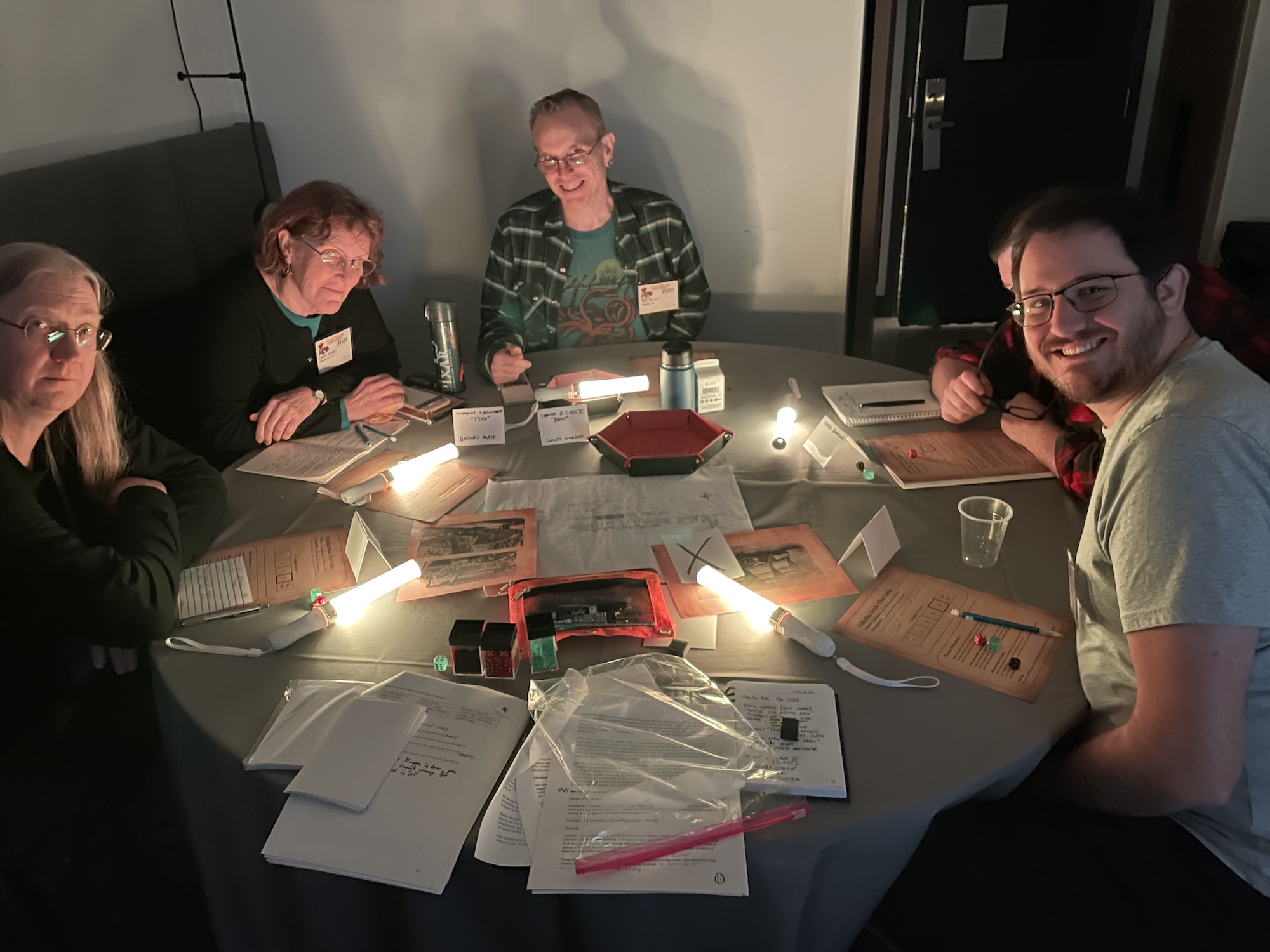 For some reason I thought it would be a good idea to run my horror scenario The Cable at noon on Friday. I have no idea what I was thinking. It’s tough for me to get in the right frame of mind to run horror during the daytime, and I wanted to try out some LED glow sticks for one of the game’s pivotal scenes. (So WTF past self?) Luckily we had wild weather and gloom all weekend, so it was easy to evoke the brooding North Atlantic atmosphere of the scenario. (The Cable, which I wrote for Cthulhu Dark, finds the doomed characters on an 1858 transatlantic cable laying expedition gone wrong.)