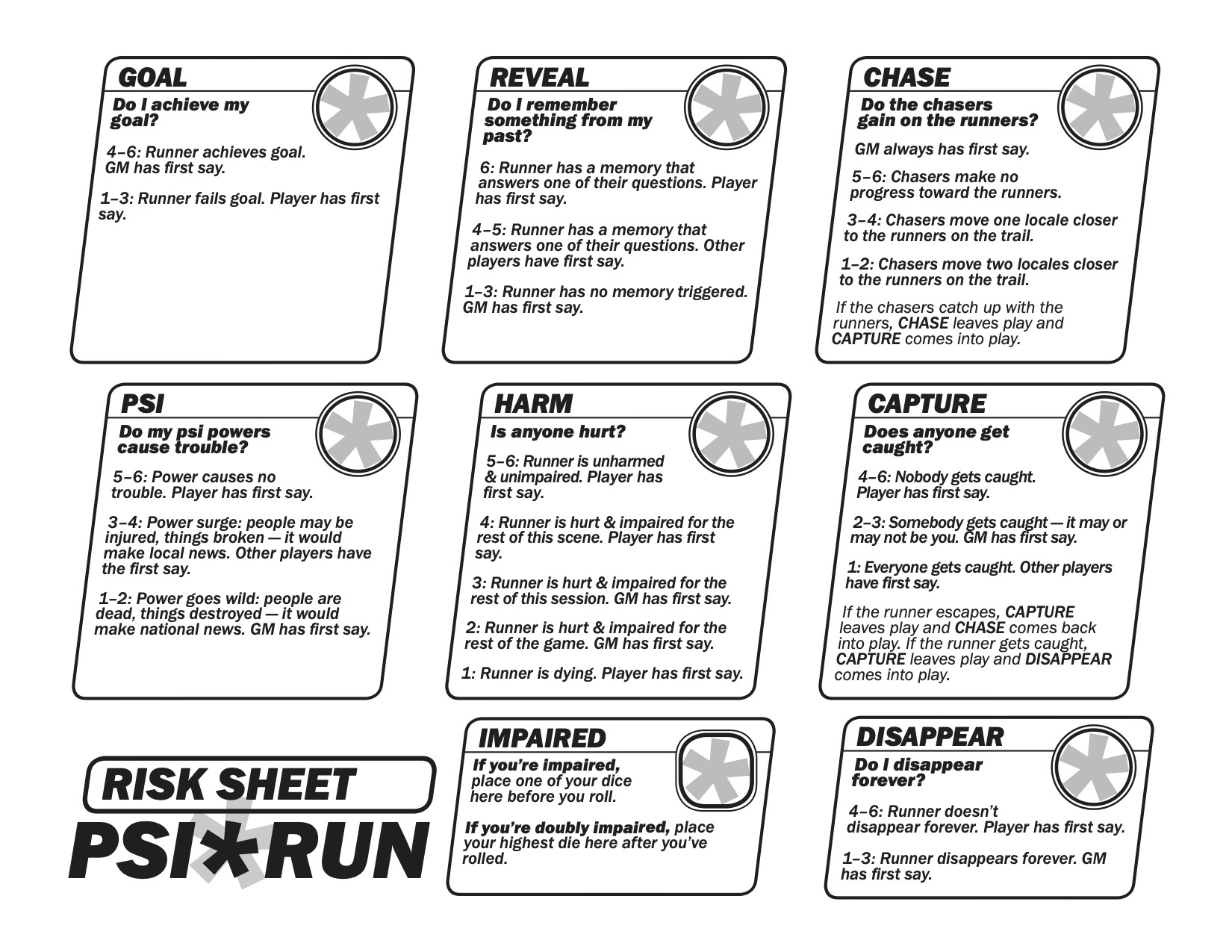 The setup of Psi*Run is also elegant. Players create characters that are enhanced in some way, but they have no memory of who they are. During character creation players write questions about themselves and their powers that they want to see answered during play. In fact the game can’t end until at least one player answers a set number of their questions. Thanks to the die mechanics mentioned above, players have to balance gaining self-knowledge against getting injured, caught, and having their powers spin completely out of control.